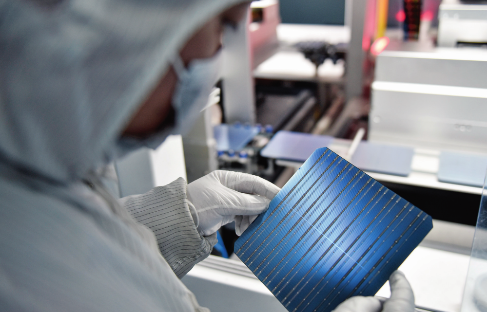 青海黃河上游水電開發(fā)有限責(zé)任公司西寧太陽能電力分公司車間,一名工作人員在檢查光伏組件(2023年2月22日攝)吳剛攝/本刊