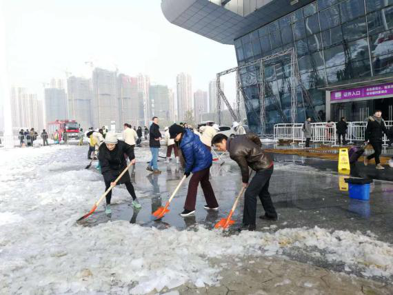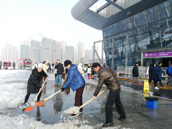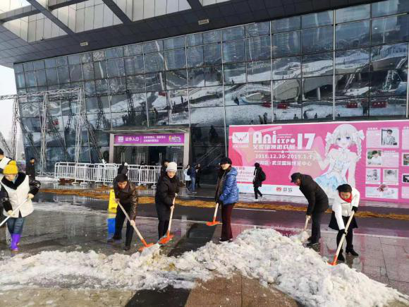 為了現(xiàn)場的人員安全,2018年12月31日清早,漢陽區(qū)會展和物流中心主任李明紅、副主任牛海彤等領(lǐng)導(dǎo)帶頭在武漢國際博覽中心開展了鏟雪除冰活動,清除展館B0登錄廳外路面積雪,消除安全隱患。大家拿著準(zhǔn)備好的鐵锨、推車、大掃帚等工具,在零下的溫度,冒著刺骨的寒風(fēng),干勁十足地?fù)]動手中的鐵鍬和掃帚,一起鑿冰、鏟雪、掃雪,場面熱火朝天。區(qū)會展辦率先垂范,齊心協(xié)力,大家花了近一個半小時時間,清掃出展館外各主要路段的積雪。通過鏟積雪、鋪草墊、排隱患、送溫暖等舉措,確保第十七屆艾妮動漫游戲展開展期間秩序穩(wěn)定,來現(xiàn)場參與活動的人員基本未受影響。